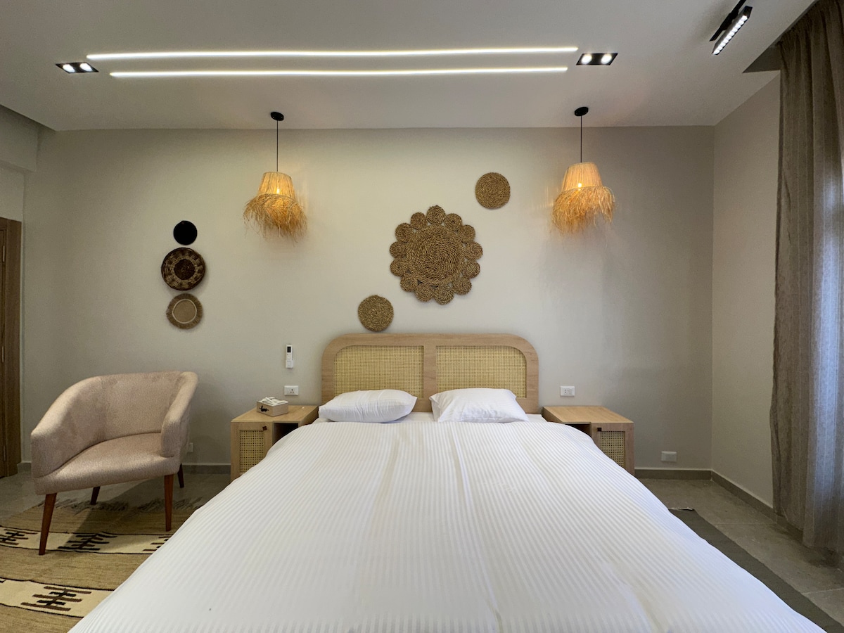 ✨在新開羅市中心體驗奢華生活! 這間優雅的2臥室公寓結合了現代舒適和時尚設計。 開放式接待區域配有豪華躺椅、設備齊全的廚房和陽光充足的用餐區域,非常適合共享用餐。 兩間主臥室均提供加大雙人床、充足的儲物空間和舒適的觸感,讓您度過安靜的夜晚。 步出您的私人屋頂花園露臺,欣賞城市景觀,是瑜伽、閱讀或晨間咖啡的綠洲。