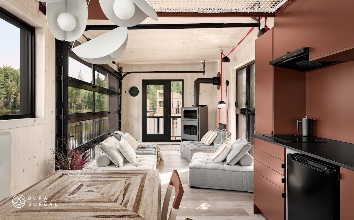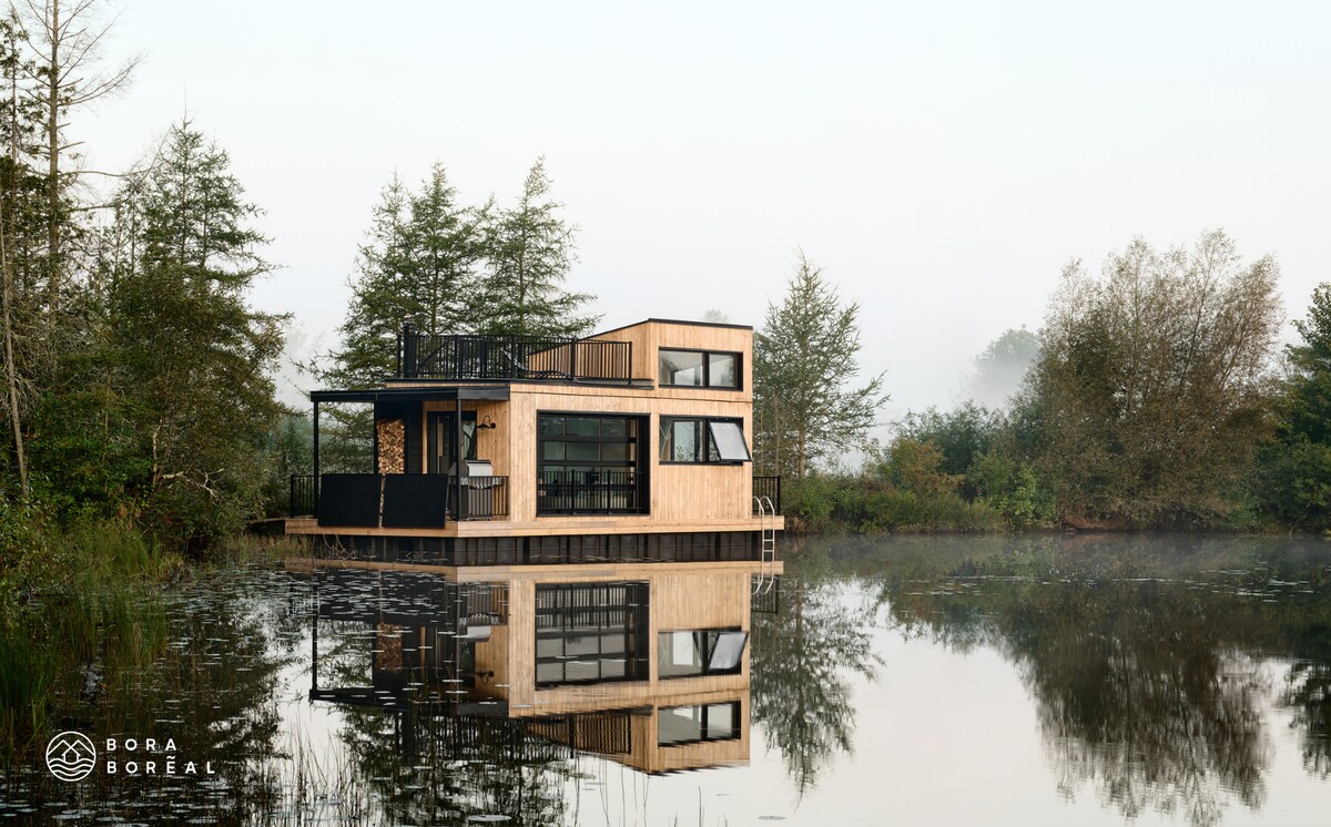 水上小木屋— Minibora Le bolet (最多4位房客) 明亮迷人的生活空間: -玻璃車庫門,享受沉浸式海濱體驗 -設備齊全的廚房和私人燒烤 牀位安排: -帶雙人牀的開放式臥室 -模組化沙發: 2張單人牀或1張雙人牀 包含: -木柴 -當地烘焙咖啡 - 11 Comtés精釀啤酒 -夏天的槳板和皮劃艇 -冬季穿雪鞋 適合狗狗入住(額外費用) CITQ: 302677