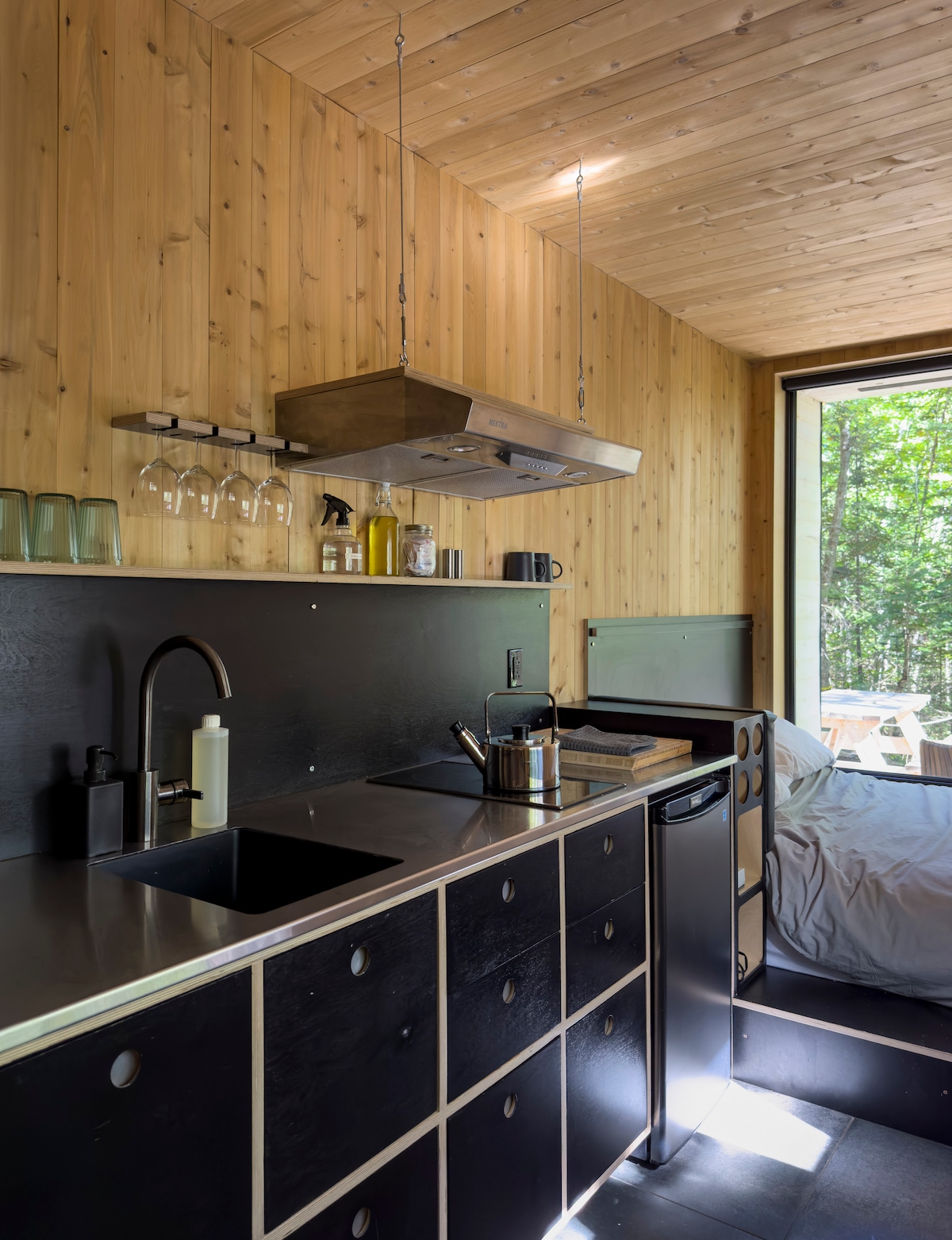 歡迎來到 Repère Boréal, 從重新利用貨櫃建造自然住宅的想法出發,您將有機會探索我們森林中這個不尋常的住宅!Shiship 配有一張大型雙人床,可俯瞰星空和森林的全景,還有一個帶沙發床的休息區、一個設備齊全的廚房和一個明亮的浴室。 (Enr. 05029)