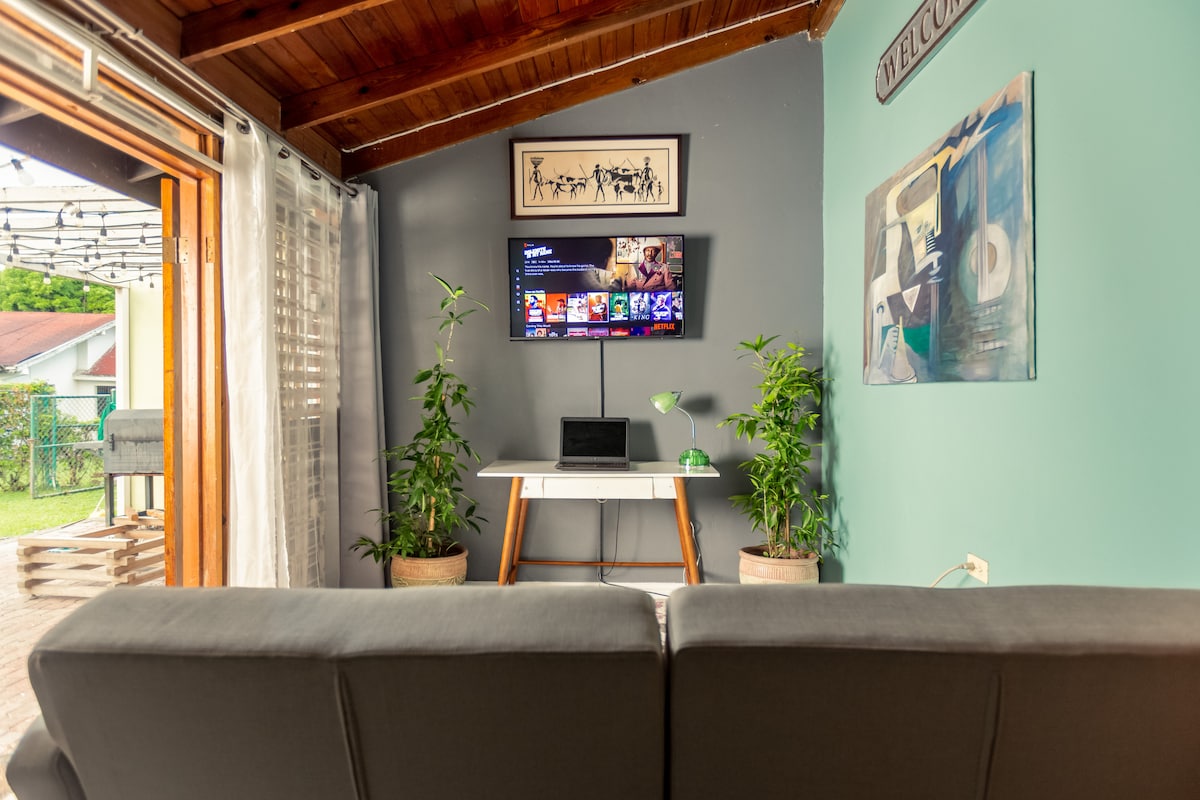 Escape to the secure Jackfoot Nook in Kingston! Walk to Jamaican eats, enjoy 100Mbps Ethernet, and relax in our deluxe AC studio. Perfect for single women, couples, and remote work, you have 24/7 hot water, unique art, a work desk, kitchen and patio. Pickleball courts are less than 5 minutes away. Jackfoot Nook offers a truly authentic and walkable Kingston experience! Being so close to Barbican, you're near to all daily essentials. Work or explore stress free knowing you have great hosts.