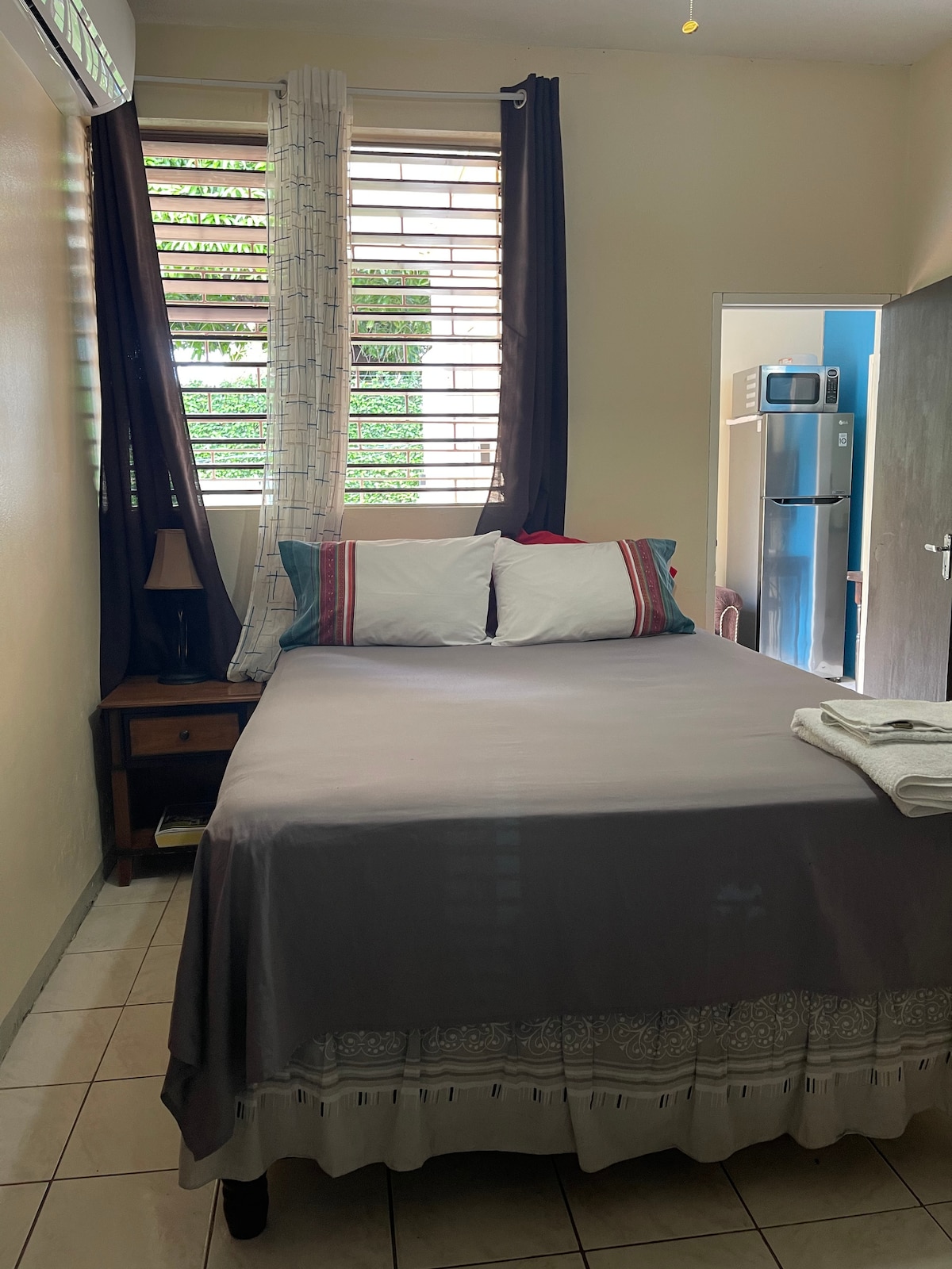 Cozy one bedroom located in Mona Heights, Kingston, Jamaica. Offering modern amenities such as A/C, hot water, Wi-Fi and cable TV. A Queen size bed is fitted with silky soft sheets and a warm quilt which is sure to give you a good night's rest. Your bedside alarm doubles as a Bluetooth speaker. All the windows and door have burglar bars and our guests have access to secure parking.
