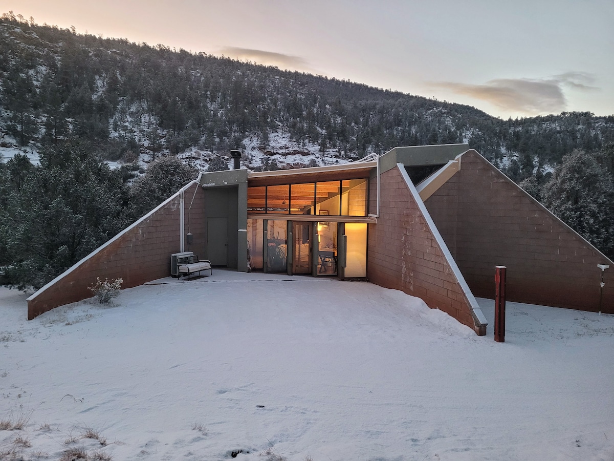 Relax in this calm, stylish space. Perfect, very private headquarters to cozy up in after exploring all nearby Santa Fe has to offer, including amazing shops and restaurants! Fabulous, world-class hiking, mountain biking, fishing, horseback riding, skiing/snowboarding and historical sites (National Forest, museums, Route 66)-all minutes away. Natural paradise- year 'round views- from extensive floor to ceiling windows! Designed by world famous architect, featured in Architectural Digest