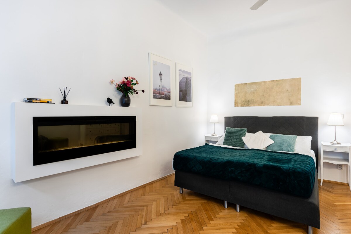 歡迎來到布拉格市中心的總統公寓 這間優雅的一臥室公寓非常適合希望在靠近主要景點餐廳和公共交通的中心位置尋求時尚住宿的情侶入住 臥室配有浪漫的獨立浴缸。公寓還提供獨立浴室,配有步入式淋浴間、起居區、設備齊全的廚房和工作空間 窗戶面向街道公寓位於二樓沒有電梯