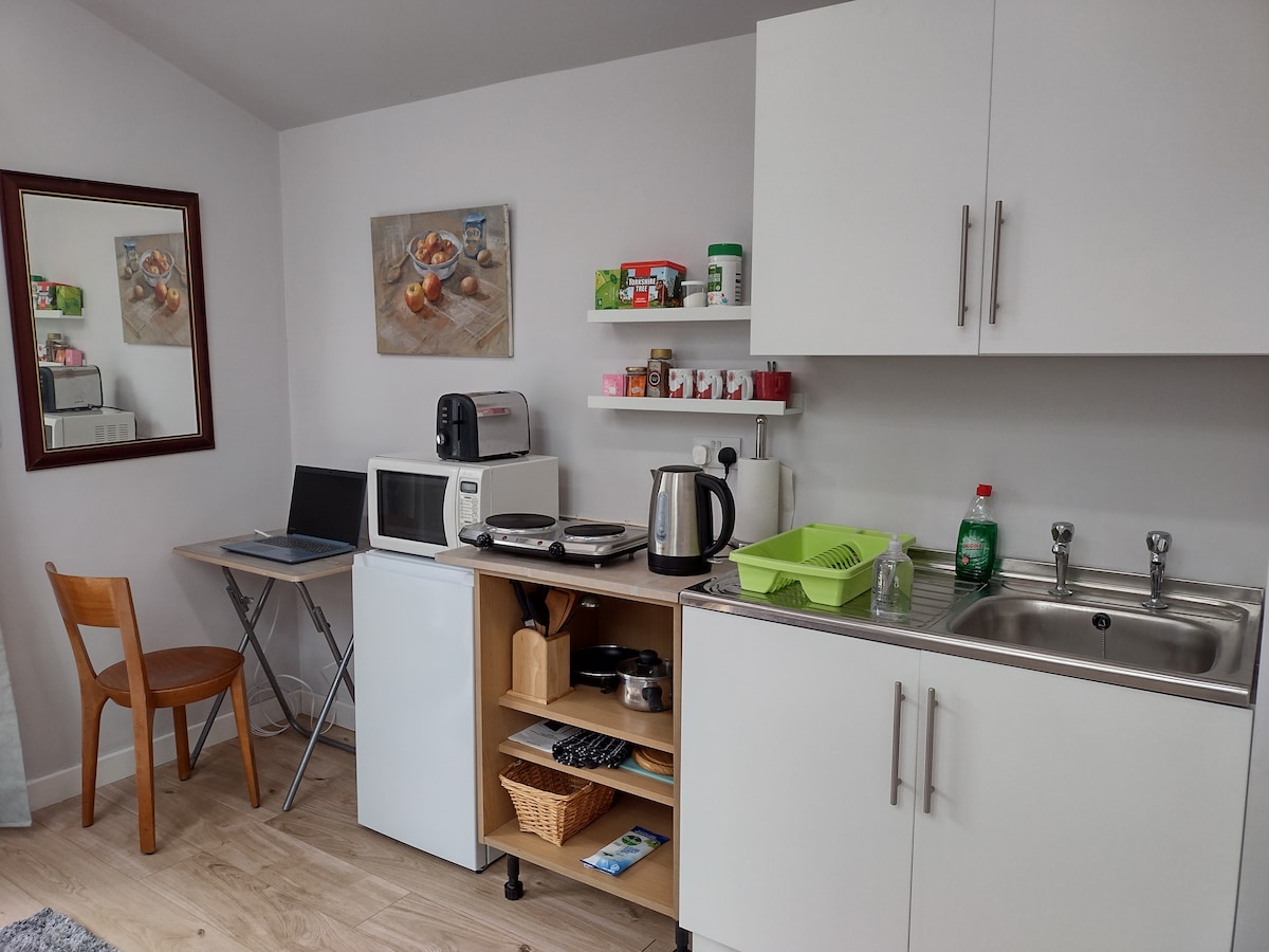 Open plan (single room) studio flatlet with separate access suitable for 1 or 2 adults sharing. Village location 4 miles from Newark-on-Trent and Newark Show Grounds. Situated on the Newark side of the river Trent. Driveway parking suitable for large van +on street parking. Tea,coffee,milk,sugar/sweeteners provided. Pub and Ashiana restaurant within walking distance. On bus route to nearby towns.