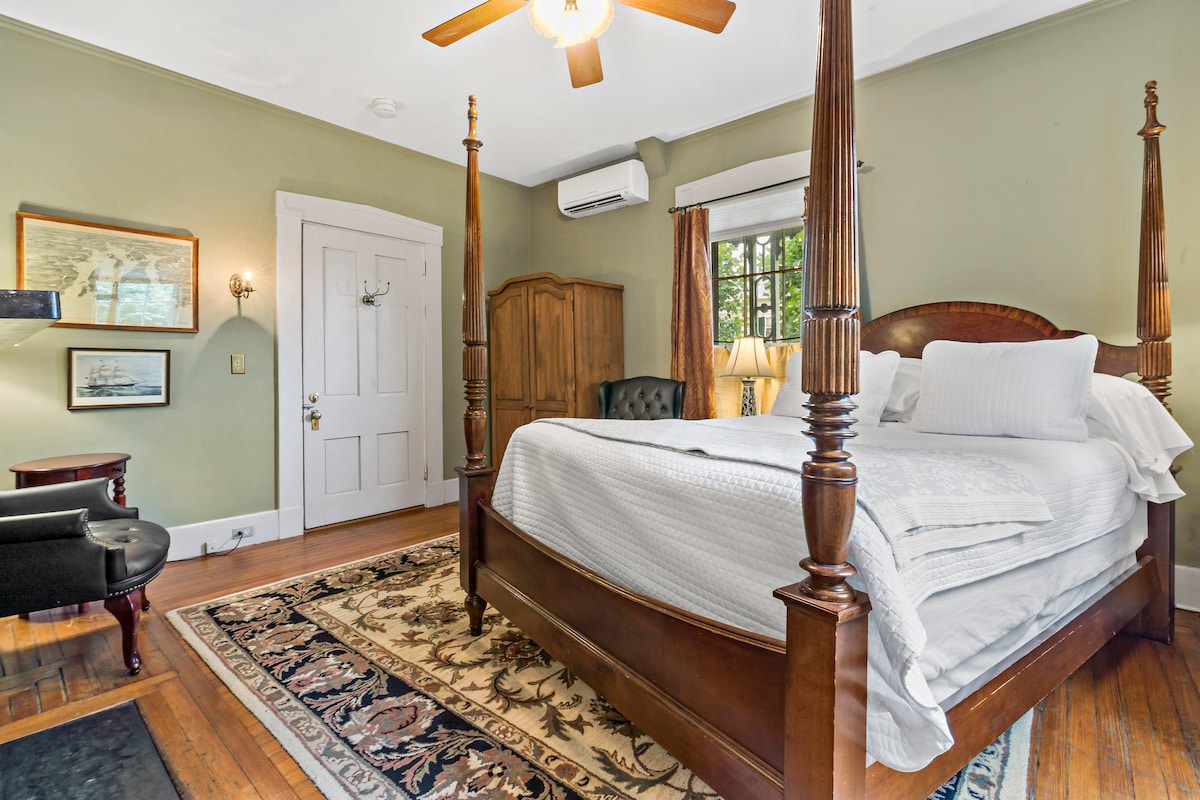 Indulge in refined luxury in the Captain's Quarters. This room features a queen four-poster bed, a private bathroom with shower, antique furnishings and decor, wood flooring, neutral tones throughout, and access to a shared patio deck. As of November 8th, 2020 we will not be offering breakfast but will rather have a to go cafe for guests to purchase breakfast, lunch and appetizer items starting in March 2021.