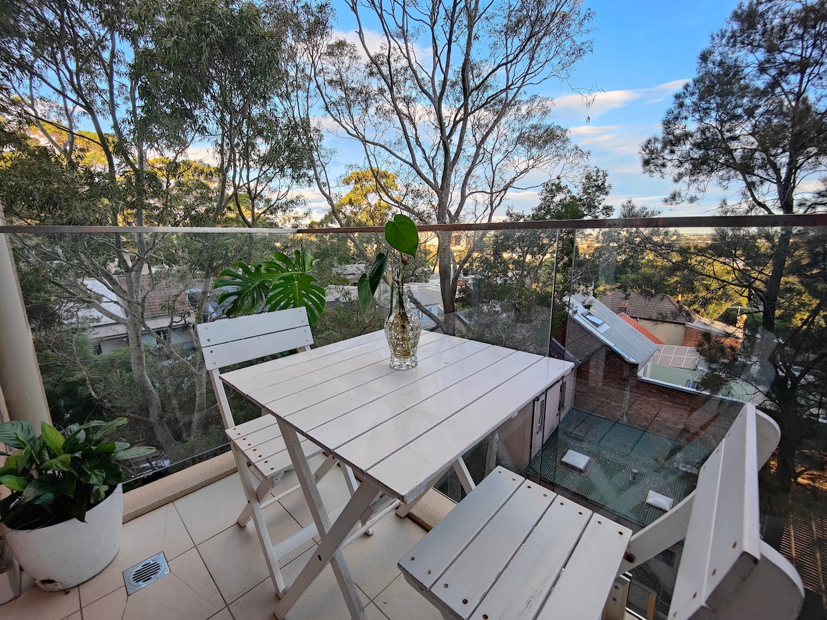 時尚安靜的獨立單間公寓,靠近雪梨最時尚的街道,有很多咖啡廳、餐廳、酒吧和商店。 有指定的車位 在一條綠葉成蔭、安靜的街道上,四周有迷人的露臺,您永遠不會相信,距離熱鬧的King St只有5分鐘路程。 靠近3個火車站,步行8分鐘即可抵達。 距離最近的僅3分鐘路程。 搭火車只需5分鐘即可抵達市區 有很多巴士連接,包括前往庫吉海灘。