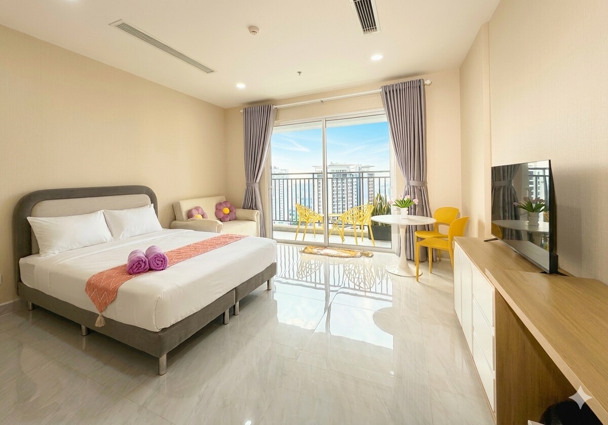 這間配有城市景觀大陽臺的單間公寓位於西貢南部的Sunrise Riverside大樓。 公寓下方有星巴克咖啡 只需幾分鐘即可抵達商場( Vivo City )和展覽中心( SECC )。 此外,還有許多便利商店和餐廳( 7-Elevent、全家便利店、K-Mart、BBQ、火鍋等) 預訂超過3晚,可免費提供客房清潔服務。 如有需要,您可以提前1天通知。