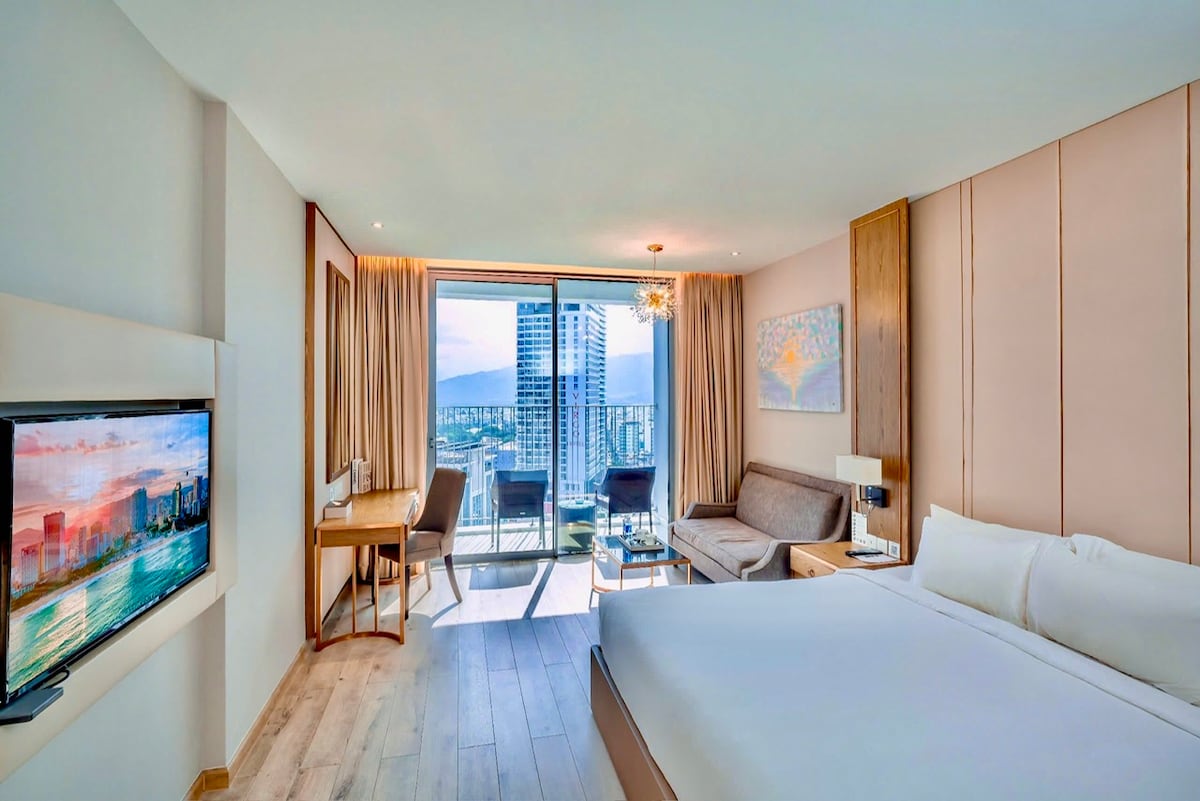 這間時尚的高樓層單間公寓位於Panorama Nha Trang,完美融合了舒適和現代便利。 從配有高級 5 星級床單的加大雙人床上,可以欣賞到落地窗外的城市景觀。 寬敞的空間內有一張寬敞的辦公桌、一台 43 吋的智慧電視,以及一間設備齊全的大浴室。 無論您是出差還是休閒,您都可以在芽莊市中心享受寧靜的度假勝地,距離海灘、餐廳和娛樂設施僅幾步之遙。