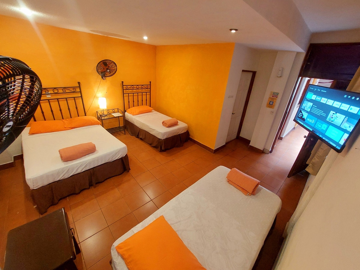Habitación cuádruple con baño privado. Esta habitación posee una cama King y una litera unipersonal, AC, baño con agua caliente. Es una habitación ideal para familia o grupo de amigos, acogedora que permite que disfrutes de la tranquilidad de estar cerca de todo pero lejos de la bulla. El desayuno no esta incluido sin embargo puedes agregar un rico desayuno típico al hacer tu check in por un cargo extra.