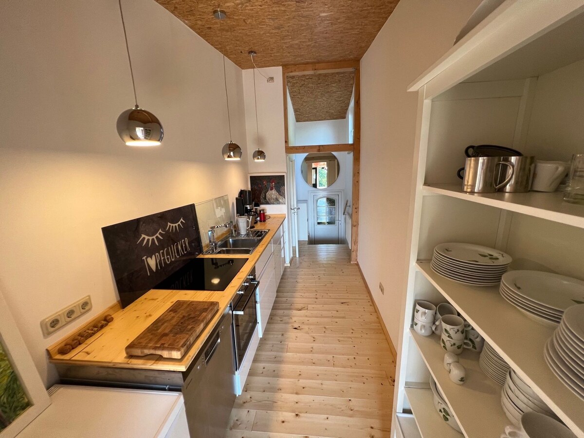 whiteloft 是我們自 2022 年 10 月起在 Airbnb 上提供的最佳位置之一。 閣樓面積約 130 平方公尺,天花板高度 5.5 公尺 50% 的空間僅用於健康與生活。 浴缸、日光浴床、2 人螺旋淋浴間和 真正的木製壁爐讓您無可挑剔。 在夏天,可以打開 5x4 公尺的門,使閣樓下方區域變成敞篷車。 大型小廚房和區塊適合舉辦活動 設備包括4xGas葡萄酒冰箱和一個電磁爐