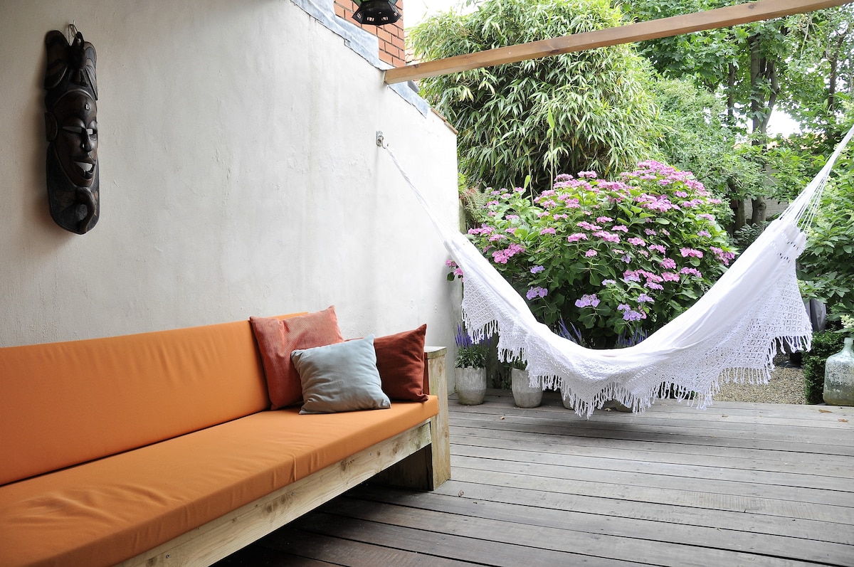 應用程式,配有臥室、開放式客廳和設備齊全的小廚房、面向南方的露臺,配有花園和燒烤區域,都沉浸在多彩的波西米亞風格中。 Gratis WiFi beschikbaar。 一間臥室公寓,配有開放式客廳和設備齊全的廚房、朝南的陽光露臺和配有燒烤設施的花園,全部沉浸在五彩繽紛的波西米亞風格中。提供免費WiFi。