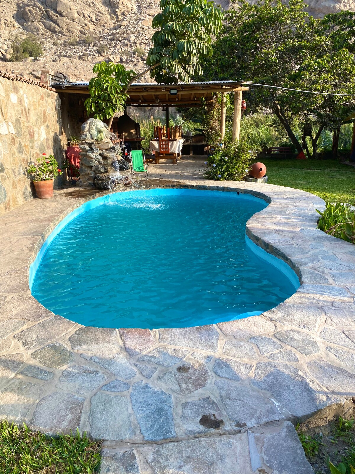 Se alquila mínimo 2 noches 1🍀 Cuatro habitaciones con baño independiente , todas decoradas como principal 👑 🛏 cupo 12 personas 2 🍀 está a 5 min del pueblito Nieve Nieve, frente a Sierra Morena , pasando Cieneguilla 45 min , km 42.5 de la carretera a Huarochiri a una hora de la Molina 3 🍀 tiene piscina 🏊♀️ 4 🍀 3000 metros cuadrados de privacidad total 5 🍀 Parrilla, Kamado, horno a leña 🪵🔥( debe llevar leña y carbón por su cuenta ) 6 🍀 check in 1 pm check out 5 pm
