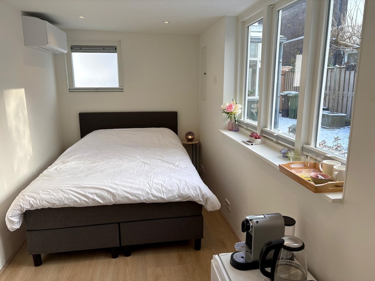 'Here it is - Tiny house' - independent space in a detached house, Nijmegen. Breakfast €8,- at 'Meneer Vos'. Extra bed for 3rd person. Close to Goffertpark, hospitals, HAN/Radboud, shopping center and nature. The city center can be reached by bicycle and bus. Ground floor with private entrance. Free parking in the street. 'Tiny house' has all the amenities for an independent stay. Common areas: 'garden room with lounge + minibar', beautiful garden and sitting area with fire pit and BBQ.