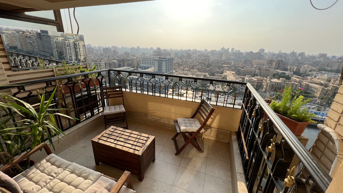 城市天際線景觀:迷人、舒適的1間臥室1間浴室公寓,位於Agouza。靠近塔赫里爾廣場、埃及博物館、扎馬萊克街區,步行即可抵達英國文化協會。美麗的露臺,可俯瞰尼羅河的美麗景色。它設備齊全,配有您可能需要的一切,新裝修。