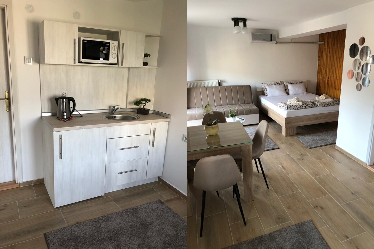 Apartment of 60 m2 in city center with free parking. About 10-15 minutes walk from Nis downtown. The flat is in the house, with separate entrance, modernly arranged with all necessary details for your comfotable stay. It consists of an open space kitchen and a living room with two sofas, large bedroom, bathroom and a terrace with beautifull city view. We will be happy to give you recommendations for city tour, good food and everything else during your stay. :)