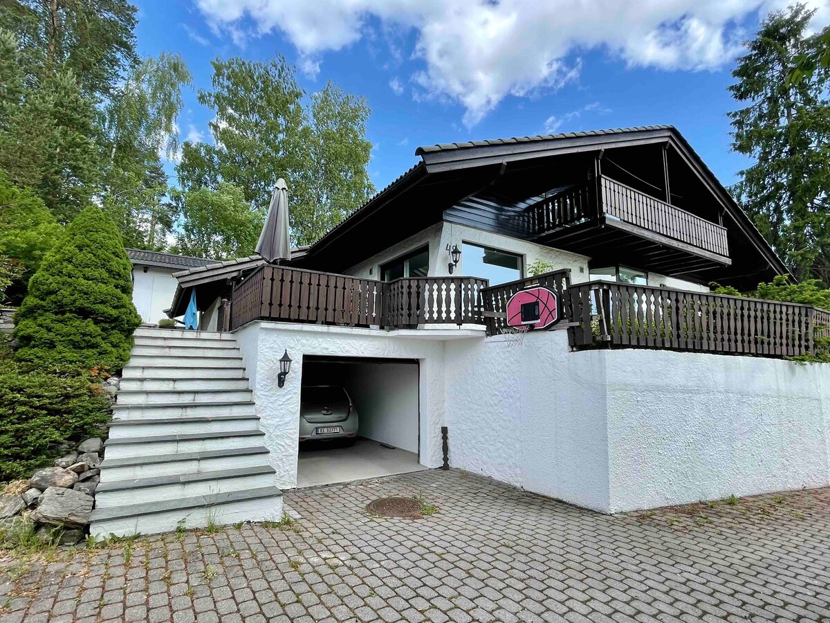 漂亮的公寓,兩間臥室,景觀迷人。 一間臥室配有雙人牀和花園景觀。 另一個是上下舖和山景。 大露臺,配有桌子和沙發,您可以在這裡欣賞壯麗的景色! 公寓配備了房客可能需要的一切。 網路、智慧電視、咖啡機、吹風機、熨鬥、毛巾、牀單、瓦斯烤架、日光浴牀和四輛自行車可供您免費使用! 步行9分鐘即可抵達前往奧斯陸的巴士,步行13分鐘即可抵達火車站