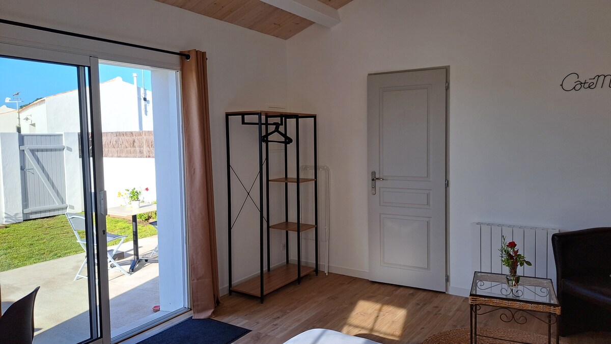 舒適的單間公寓,可供 2 人入住 - 狀況完美、1 張床 140/190、電視、配有微波爐和冰箱的全套小廚房。配有馬桶和步入式淋浴間的浴室。 俯瞰有圍牆的花園+戶外家具。 腳踏車租借、法國滾球球場。 安靜,靠近大海和市中心。 簡單精緻的氛圍 2人入住的價格