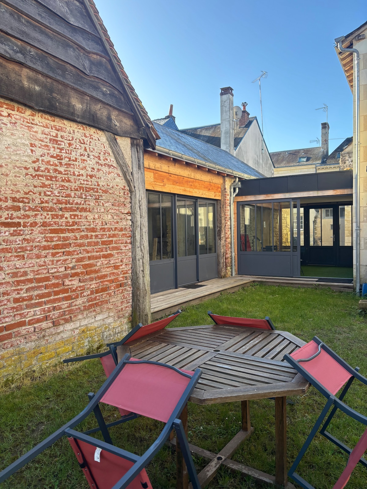我們的房子建於 14 世紀,位於杜蘭 (Touraine) 的中心,該地區以其城堡和美酒而聞名。 房子面積為 180 平方公尺:一樓有 2 間臥室(1 張雙人床 160x200 公分和 2 張可合併的單人床)、1 間廚房、1 間餐廳、1 間客廳、1 間浴室。 二樓有 1 間主臥室(雙人床 160x200)、1 間浴室和 1 個迷人的小遮蔭陽台。 花園面積為 600 平方公尺,包含一個私人加熱式泳池。