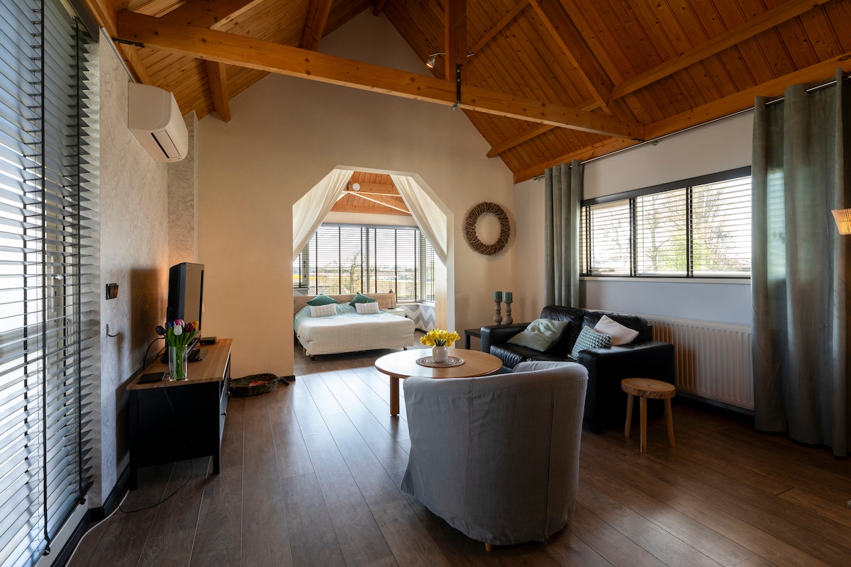 Aan de rand van de Hollandse duinen ligt, te midden van de Noordwijkse bollenvelden, ons charmante natuurhuisje. Het is de ideale plek om te ontsnappen aan de drukte en even tot rust te komen in een uniek landelijk gebied. Geniet vanuit de glazen woonkamer of het overkapte terras van het prachtige uitzicht op de paarden en de velden. En met de prachtige kustlijn (15 minuten lopen), het gezellige Noordwijk (25 minuten) of de bruisende Bollenstreek is afleiding nooit ver weg.