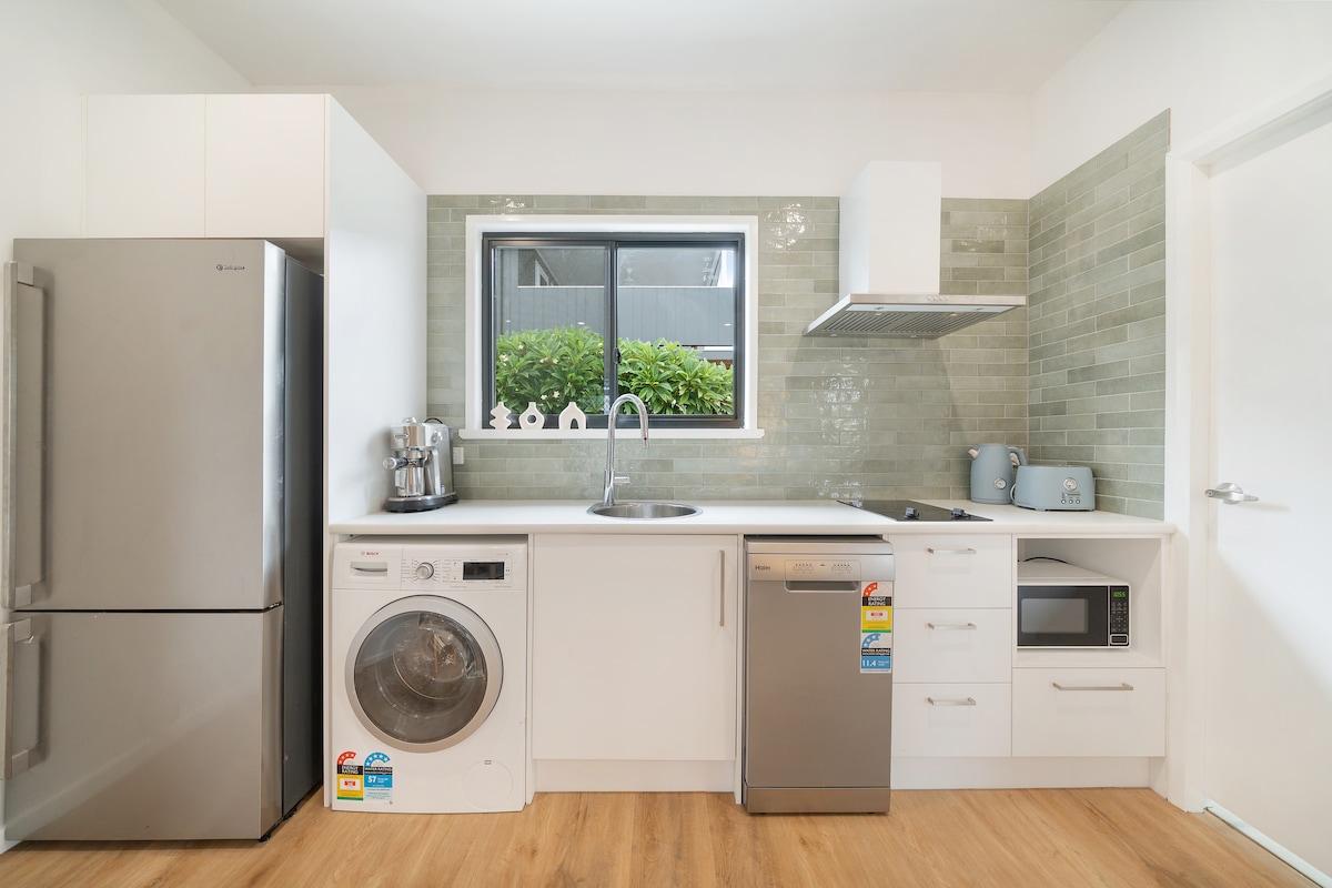 時尚現代的獨立單位毗鄰河流,可從私人露臺欣賞水景。步行即可抵達咖啡廳、餐廳、俱樂部和酒吧。開車5分鐘即可抵達海灘。房源提供免費WiFi、Netflix、洗碗機、冰箱和冷凍櫃、微波爐、烤箱和爐台。提供茶、糖和咖啡包系統。獨立臥室,配有大床,浴室和獨立廁所。所有房間配備風扇,全屋配備空調。提供床單、吹風機、熨斗和熨衣板。