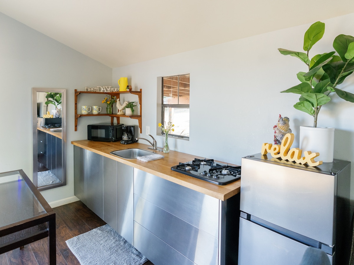 Escape to our charming, rustic studio-style bunkhouse nestled on 5 acres in the desert just outside Ridgecrest, CA. This cozy western-inspired retreat offers a peaceful getaway or a convenient stop on your way to Death Valley, Mammoth Mountain, Lake Tahoe, or Southern CA. Unwind by the shared fire pit or cook up something tasty in the BBQ area. Located only 5 miles from city center, the bunkhouse borders public land, offering direct access to off-roading, hiking, and mountain/dirt bike riding.
