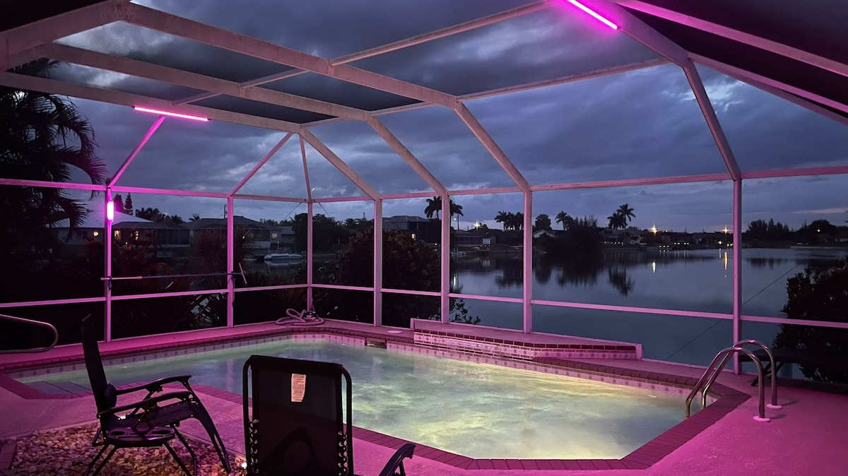 寬敞華麗的4間臥室和2間浴室度假屋,配有1張加大雙人牀、3張加大雙人牀、2張加大雙人牀、1張單人牀、1張沙發雙人牀。最多可輕鬆入住12人。 夢幻海岸主題的房源。 著名的私人加熱泳池和運河通道(將自己的小船或水上摩託艇停放)。 在Caloosahatchee河釣魚(從房源開船僅8分鐘)。