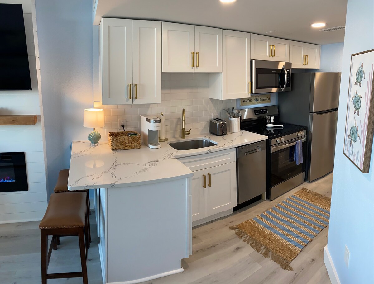 改造公寓,步行即可抵達海灘。 全新加大雙人牀、房間遮光窗簾、新家具、智能電視、配備記憶泡沫牀墊的1.8米寬雙人牀等。 更新後的廚房配備了所有設備,包括Keurig。 小屋1層、獨立陽臺、電梯和高速WiFi。 Ocean Creek擁有室內/室外泳池和熱水浴缸、海灘酒吧、餐廳/休息室、網球場、會議中心和美麗的海灘。 街對面是赤腳登陸地,靠近所有主要景點和餐廳。