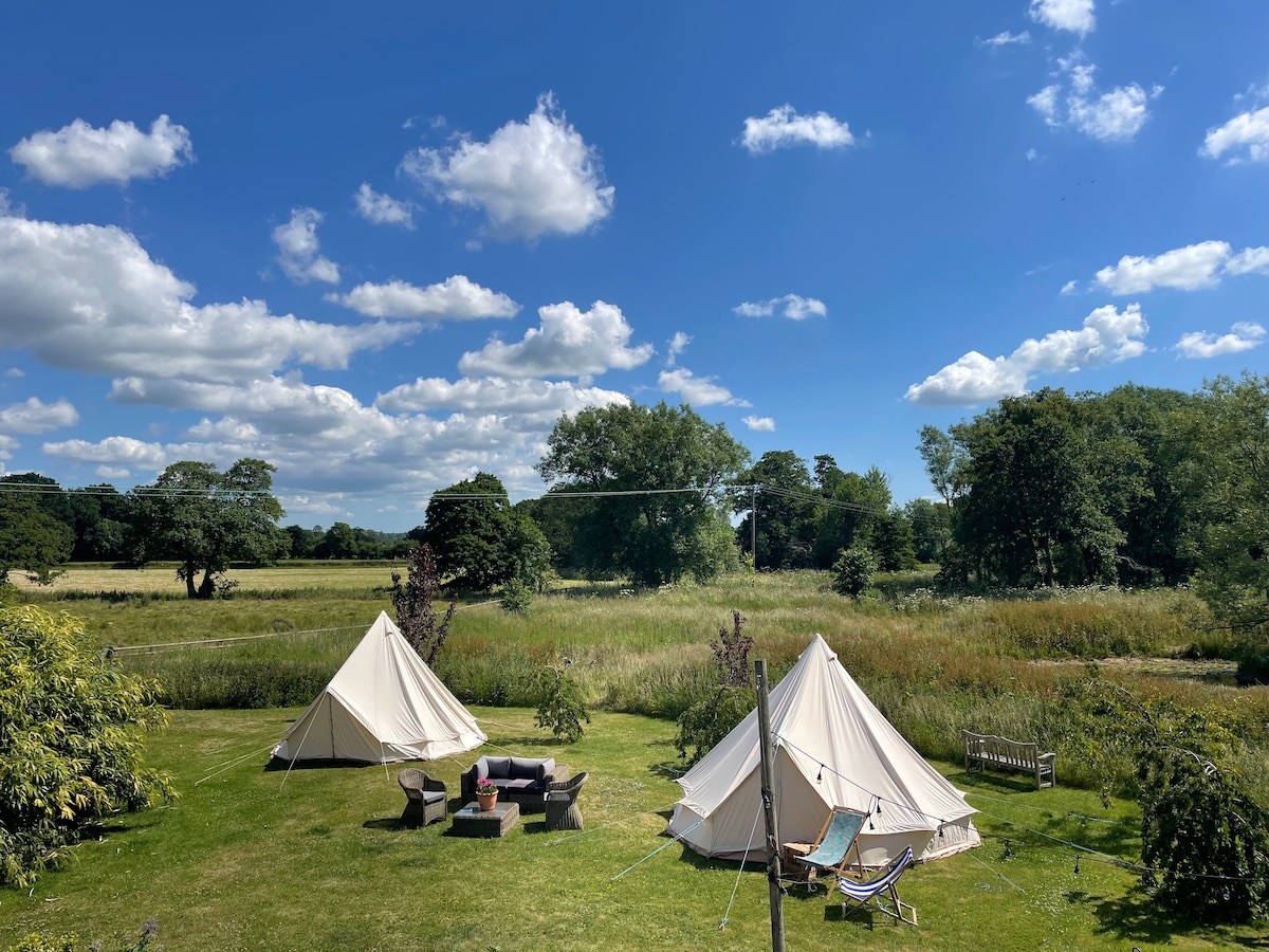 belltent with communal outdoor kitchen with everything needed to cook , bbq, firepit, double beds, lights etc. Just bring your bedding, charcoal, wood, and clothes! All activities at the farm included boats, goldings mini sand beach by the crystAl clear chalk stream, 60 acres of grade 1 listed meadows woodland rivers. Meet feed our friendly donkeys, piglets, walk our mini goats, arts crafts ,, zipwire woodland area, collect eggs from our chickens plus much more .