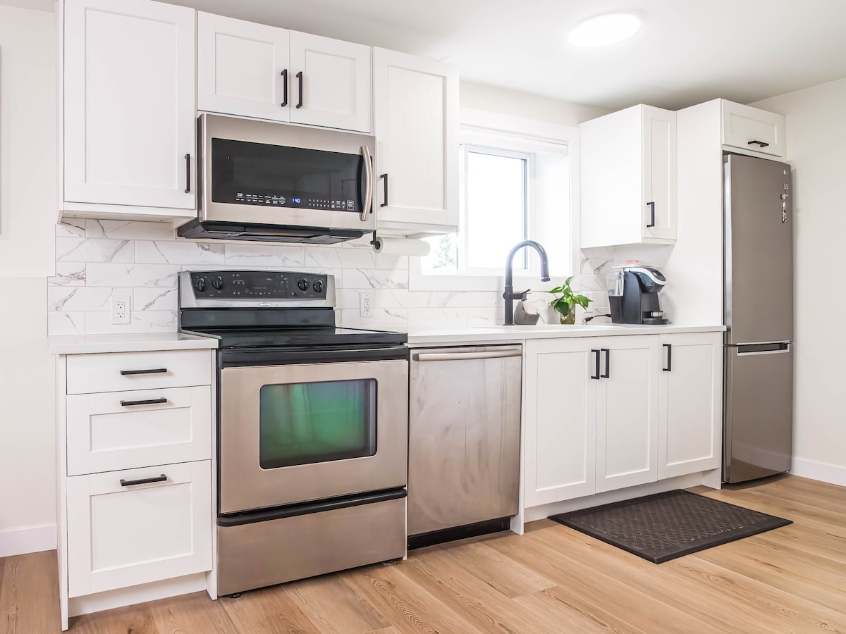 歡迎來到我們位於地下室的舒適獨立套房,有獨立入口!位於安靜的區域,距離機場5-8分鐘,距離市中心15-20分鐘,距離班夫1.5小時! 寬敞的起居空間,配有舒適的沙發、風扇暖氣和智慧電視(包括Amazon Prime影片)。臥室有一張雙人床和大衣櫃。 設備齊全的廚房,配有爐具、冰箱、微波爐、烤麵包機和咖啡機。獨立步行入口,讓您享有完全的隱私和獨立。街邊停車位。