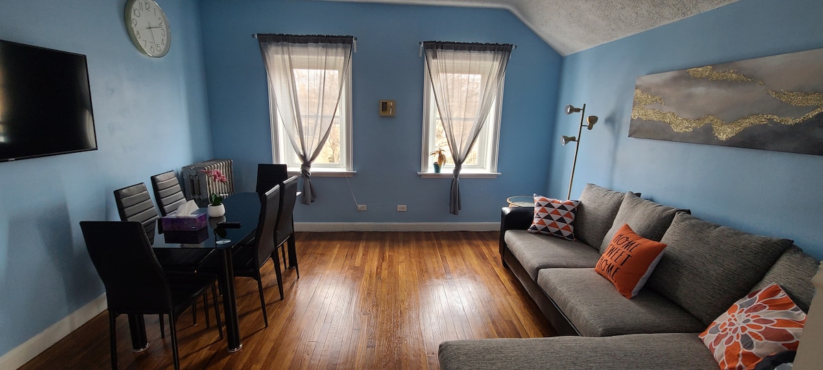 這間經典的芝加哥兩層公寓(又名Hamlin House )建於1908年,讓您像當地人一樣生活。起居區域有精美修復的硬木地板和最近修復的浴室。我們希望您在洛根廣場(Logan Square)感受到家的溫馨舒適!房源配有廚房,配有餐具、廚具和足夠的餐具,可供娛樂。我們會隨時為您解答問題,並協助您瀏覽該地區。非常適合家庭、朋友和短期或長期住宿。