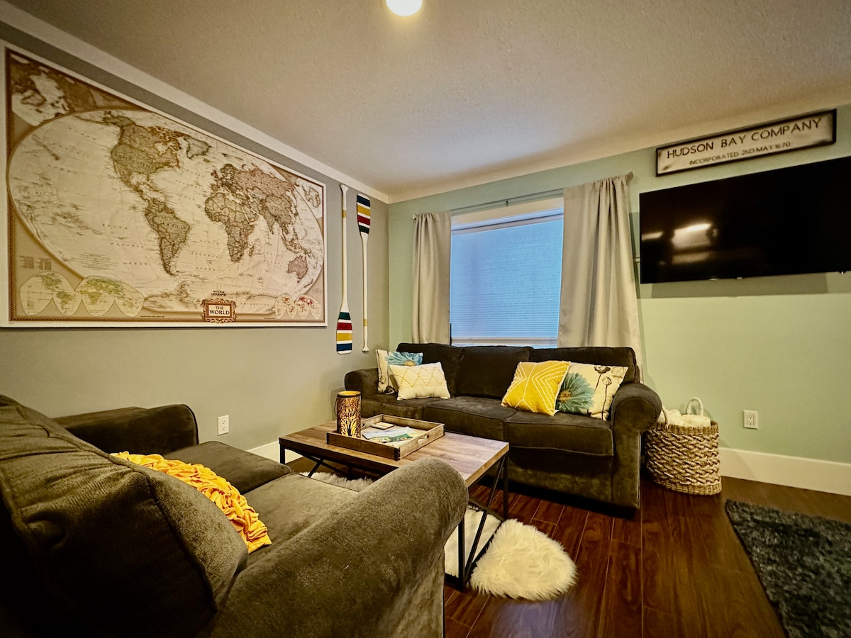 位於安靜街區的獨立套房,配有全套廚房、洗衣機/烘衣機和浴缸。 靠近Copper Ridge的健行和自行車道。 附近有雜貨店和酒吧。開車10分鐘即可抵達市中心。 客廳裡有沙發牀,配有丙烷壁爐。 歡迎寵物入住。私人車道。 燒烤、露臺、火桌和圍欄狗窩。 有圍欄的後院和按摩浴池可供使用,需提前通知。