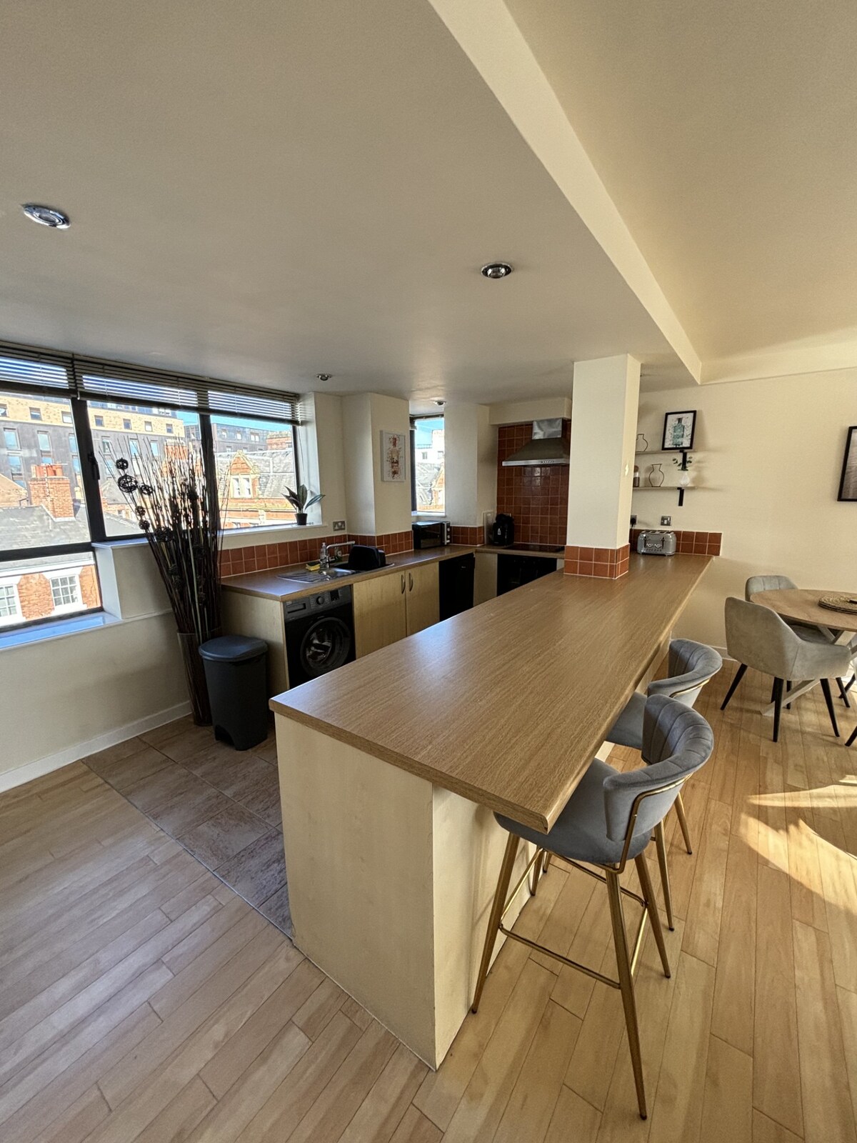 時尚的3樓2間臥室,位於諾丁漢市中心的中心。 非常適合前往市內休閒或長期住宿,非常靠近大學。 漂亮的陽臺,非常適合坐在外面。 設備精良的廚房,備咖啡機。 臥室尺寸都很棒,均配有套房淋浴間-其中一間配有辦公桌。 位於市內南側的蕾絲市場區域,一切都在門口。