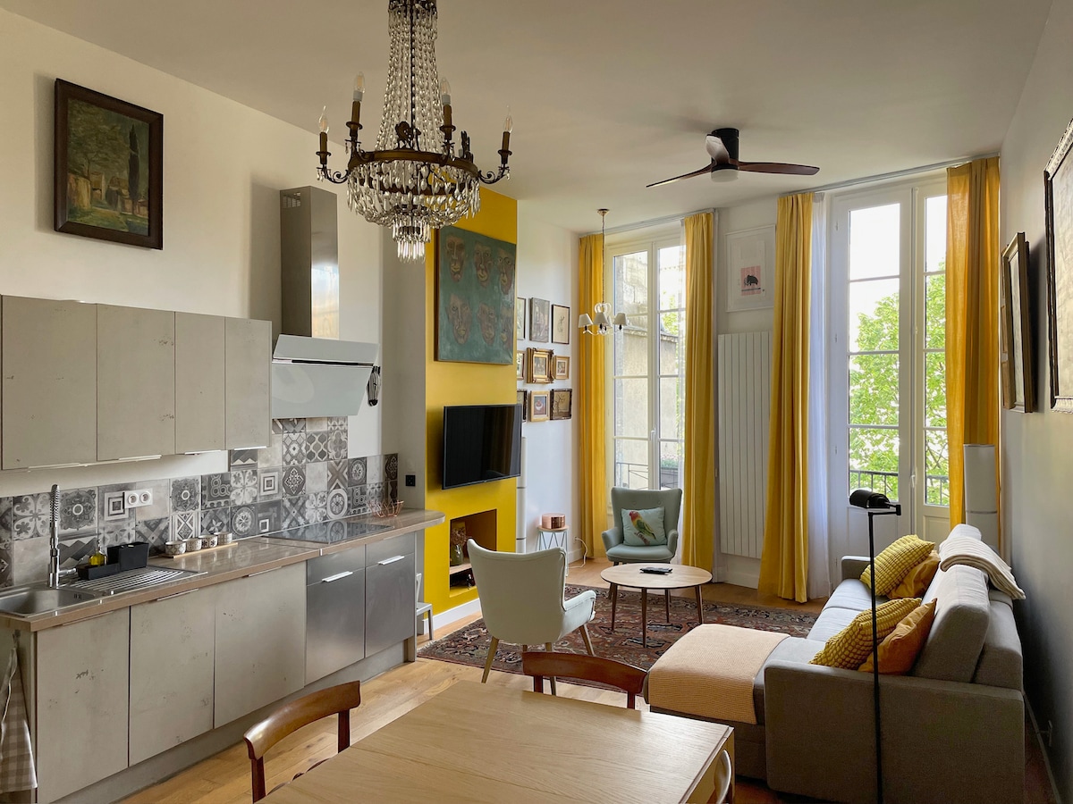 Nous vous invitons à venir découvrir ce bel appartement de 60m2, idéal pour 2 ou 3 voyageurs. Situé au coeur historique de Bordeaux, il allie le charme de l'ancien (parquets, belle hauteur sous plafond, joli balcon) au confort du moderne (cuisine équipée, ascenseur). La chambre spacieuse donne sur une cour intérieure, la SDB est entièrement rénovée avec une douche confortable et spacieuse. le séjour est agrémentée d'une cuisine entièrement équipée. Le salon s'ouvre sur un joli balcon.