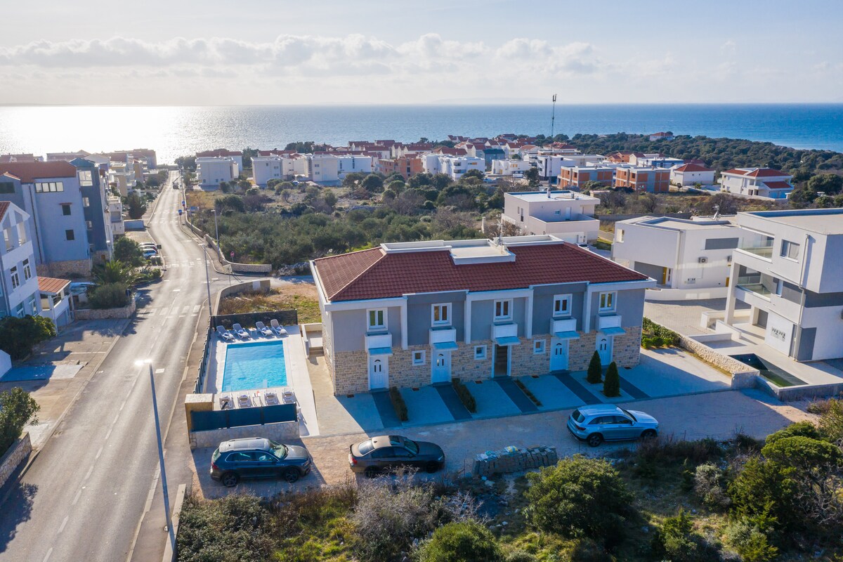 現代豪華別墅,配有遊泳池,可欣賞海景。 別墅有5套現代化家具公寓,可供6人入住,配有寬敞的露臺和美麗的海景。 公寓提供免費WiFi、空調和停車位。 花園裡有一個漂亮的遊泳池(與其他房客共用) ,房客可以在白天安靜地放鬆身心。 別墅距離海灘僅幾分鐘步行路程,距離市中心不遠。 別墅旁邊有前往Zrce海灘的雜貨店和巴士站。