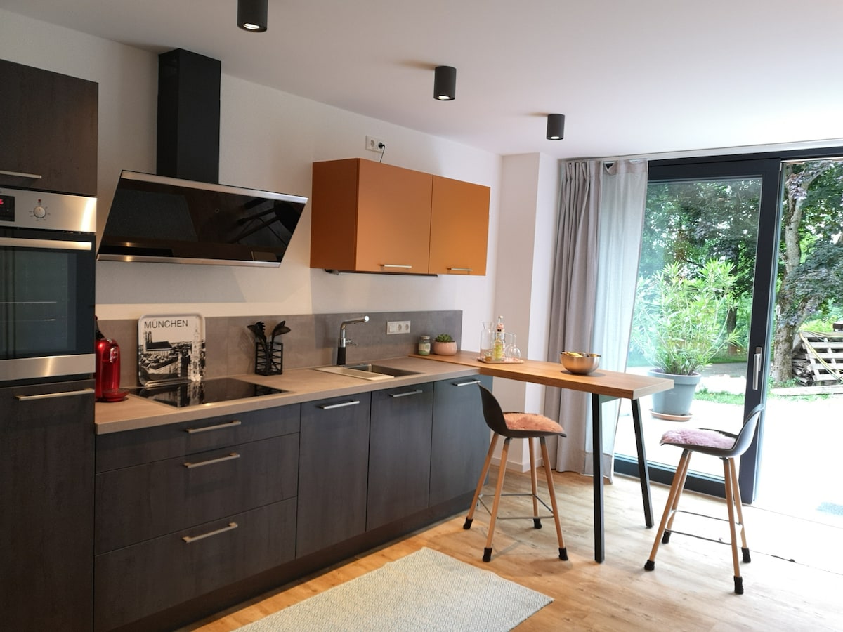 Die Design Loft-Wohnung besteht aus einem geräumigen Zimmer mit einer großen Schlafcouch (für Dauerschläfer) und TV sowie einer komplett eingerichteten Küche mit Spülmaschine und einem modernen Bad zur Alleinbenutzung. Das Haus liegt ruhig gelegen mitten im Wald auf einer Lichtung. Parkplatz direkt vor der Tür. Ein Ort zum Entspannen und Krafttanken. Bäcker und Lokale im Ort erreichen Sie zu Fuß. Badeseen (Chiemsee, u.a.) Biketouren (BikePark Samerberg) und die Berge sind direkt vor der Tür.