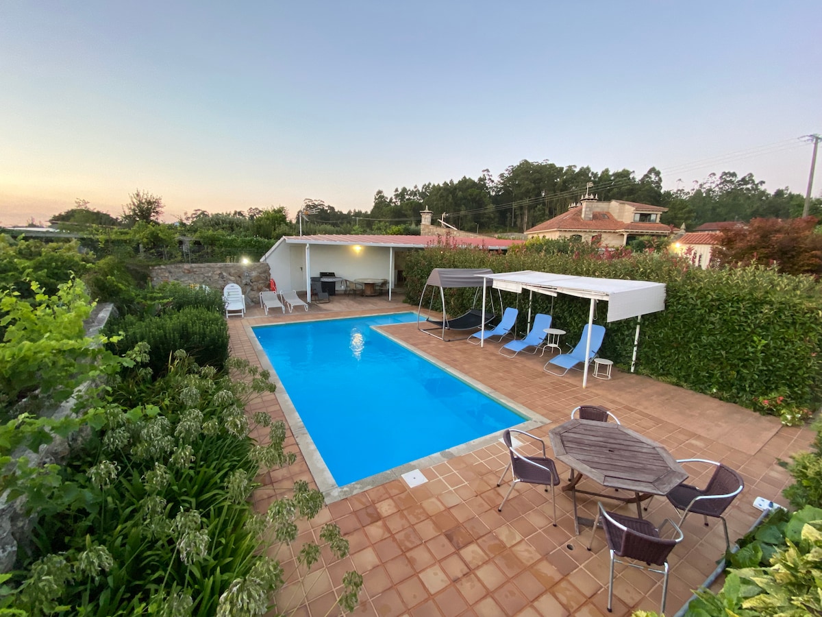 Fantástico alojamiento con piscina privada para los huéspedes en el corazón de las Rías Baixas, cerca de todos los centros turísticos de la zona: playas espectaculares, senderismo, golf, rutas a caballo, pueblos marineros, bodegas, pazos, furanchos y mucho más... Dispone de amplios ventanales con una decoración exquisita estilo moderno/vintage, un precioso jardín con piscina y barbacoa preparado para que disfrutéis y os sintáis como en casa. Casa accesible para PMR (rampa y en una sola pla