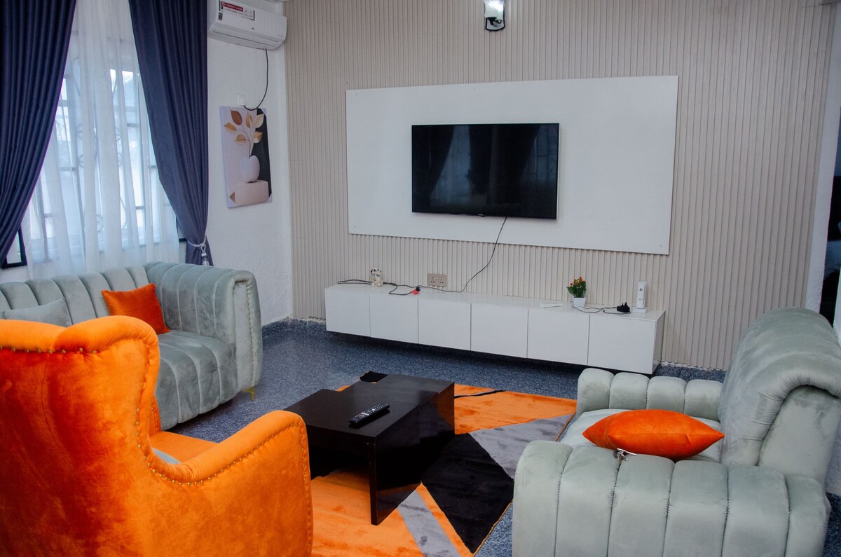 這個時尚的住宿非常適合團體旅行。 位於阿庫雷市Alagbaka地區的一個獨特的地方,位於一個封閉和安靜的郊區。 這棟4間臥室的西式房屋配有上鎖的車庫、開放式廚房、環境照明、洗衣機、現代家具、智慧電視、內置微波爐、無線網路和24小時供電,由混合太陽能系統和30-KVA發電機供電。 如果房客選擇使用發電機,他們須自行負責加油。