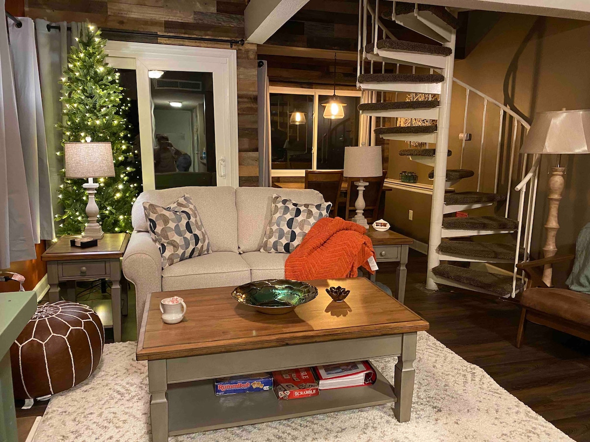 體驗這座精美重新設計的公寓的魅力,坐落在加特林堡市中心的正上方,但步行即可抵達! 享受豪華特大床,配有套房浴室、小廚房、兩台電視、Wi-Fi 和配有壁爐的舒適起居空間。 在火邊放鬆身心,在私人陽台上喝咖啡,游泳或探索煙霧山脈-您可以選擇! 噓...別忘了我們通往市中心的私人「秘密」樓梯,節省時間、麻煩和停車費!