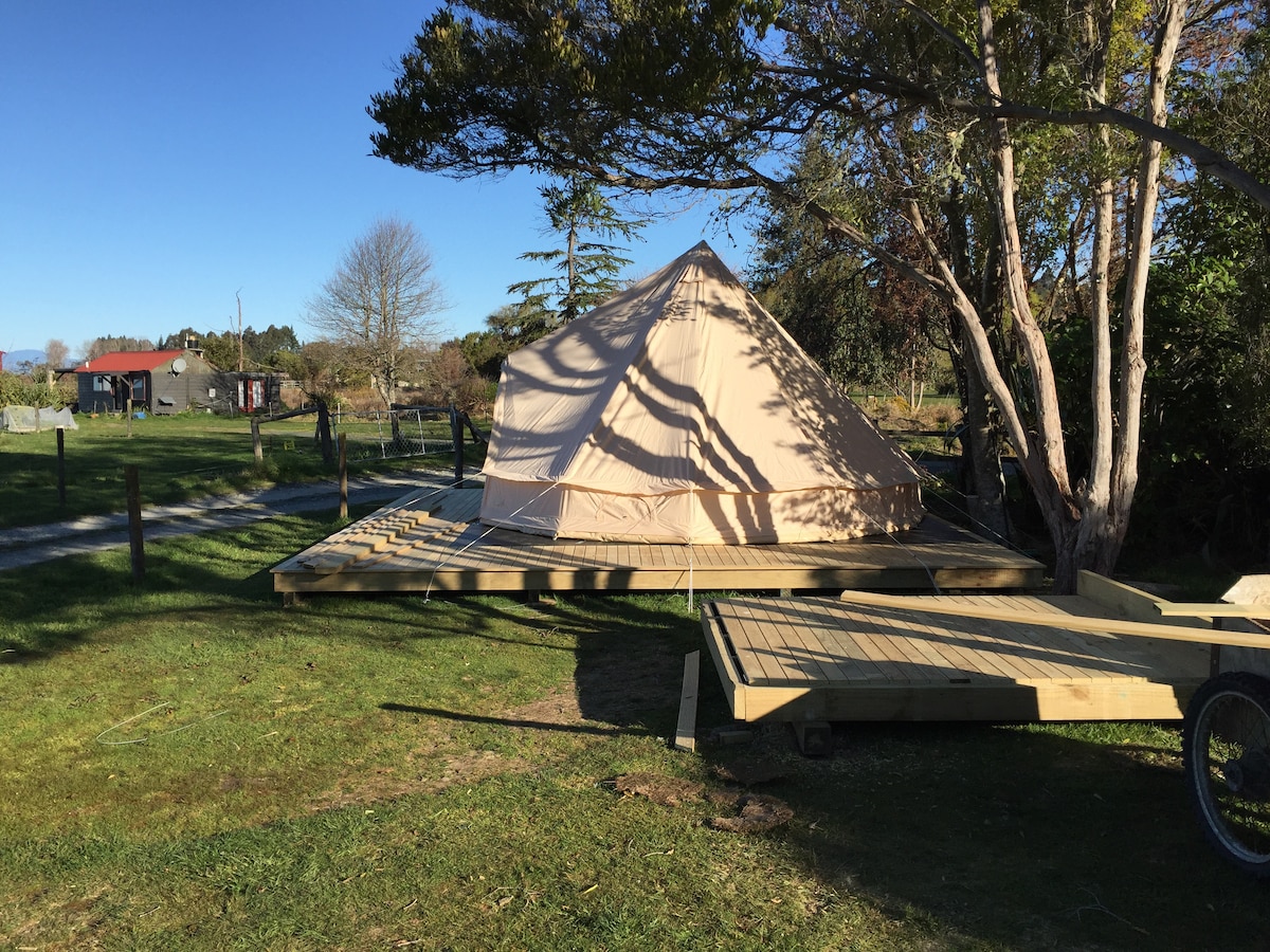 醒來欣賞塔斯曼灣的日出,聽鳥鳴。這個印第安帳篷將風格重新融入經典的奇異果露營之旅。戶外座位、豆袋和壁爐,配有私人設備,讓您和您的伴侶享受真正難忘的體驗。此外,我們距離Abel Tasman的起點只有100公尺,所以放鬆一下,讓潮水進來,讓人們看著紐西蘭開始偉大的Abel Tasman Track。