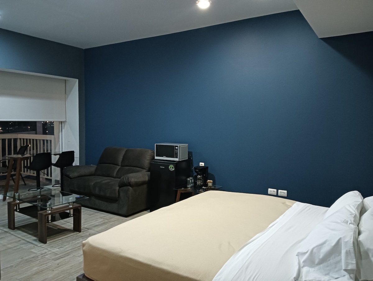 Luxury loft with terrace in Sonata Towers, Lomas de Angelópolis. Features a bedroom with a double bed, plush closet, TV, and a full bathroom with premium fixtures. The living area includes a sofa, dining area with microwave, frigobar, coffee station, and desk. Enjoy covered parking, valet service, and room service from the in-building restaurant. Steps from the vibrant Sonata District—shops, dining, and cultural activities. Ideal for business or leisure, with 24-hour security for a safe stay.