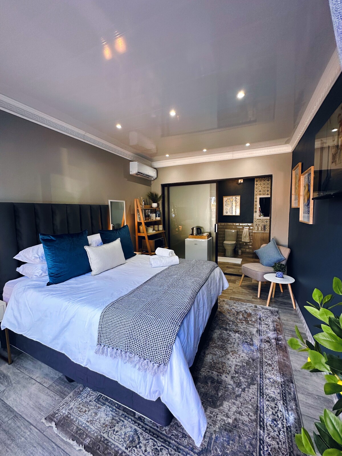 The Luxury Studio features a queen-sized bed and an en-suite bathroom. Enjoy Wi-Fi, air-conditioning, and a smart TV with DStv and Netflix. A well-equipped kitchenette with a gas burner, microwave, and fridge adds convenience to your stay.