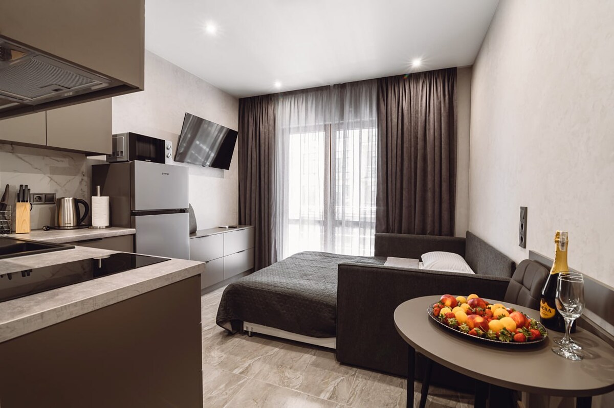 Стильный номер в гостинице общей площадью 35 м, который находятся в пешей доступности к морю. Имеется бассейн, спортзал, закрытая охраняемая территория. Просторная гостиная, санузел. Есть место для машины во дворе и гараже. Предлагаем вам отдых в статусном отеле премиум класса, который находиться на ул. Леваневского, в одном из наиболее престижных, районов города. Невысокое количество номеров выгодно выделяет среди современных новостроек.