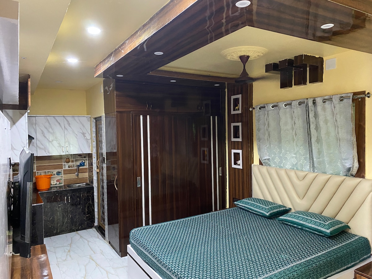 Family friendly 1 BHK type with – Hall (living and Kitchenette with sofa-cum-bed) plus a bedroom with a queen-size bed and attached bath. Suitable for 4 adults. Privacy, security and calmness at the heart of Jagannath Puri just 300 M walking distance to Jagannath temple. Fitted with WC, Geyser and 1.5 ton A/C. with gas, cookwares and necessary sleeping systems for a comfortable stay for 4 adult / a family.