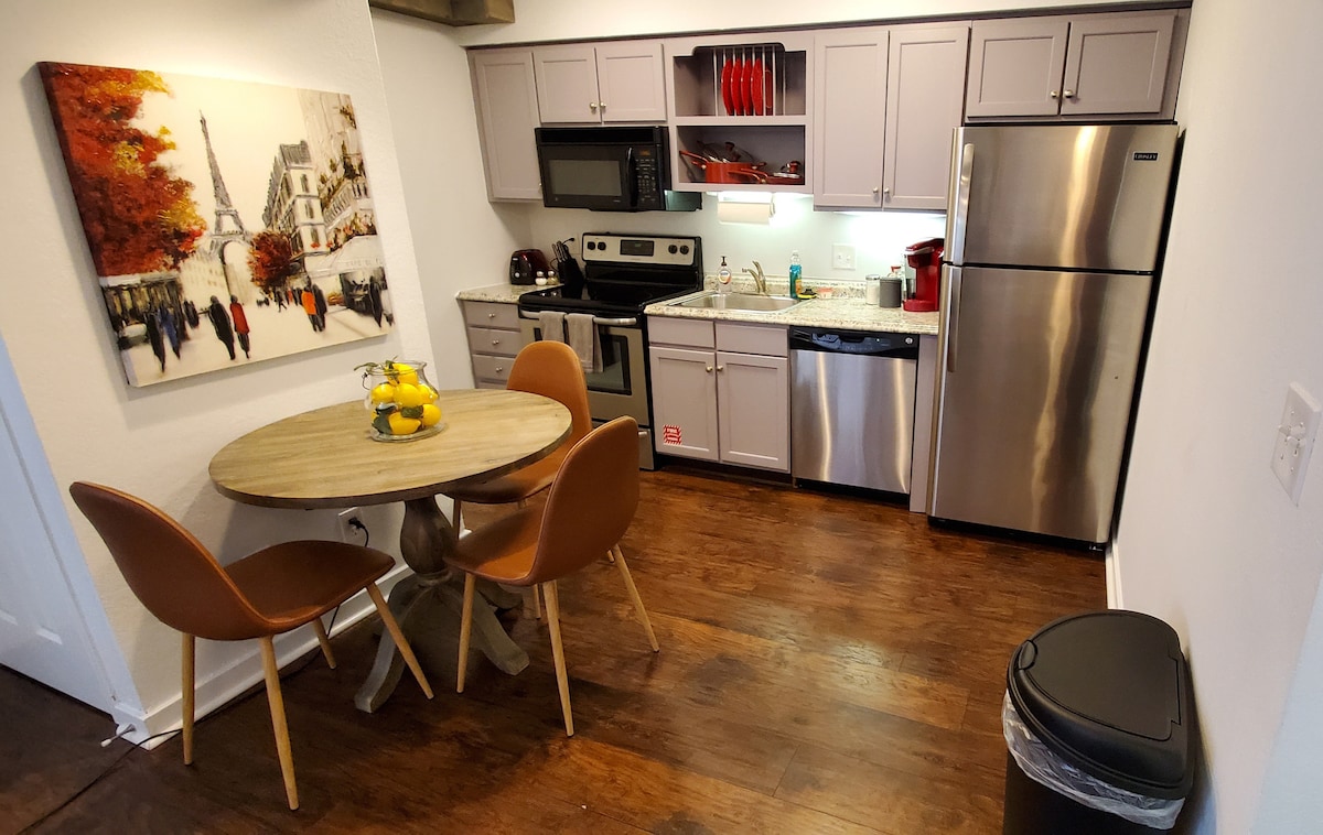 精美翻新的豪華公寓,可欣賞迷人的湖景!非常適合短期行政住宿。石英檯面、加熱浴室地磚、2人紅外線桑拿房,配有整合式藍牙音響、95加侖浸泡浴缸、獨立噴霧淋浴間、多合一洗衣機/烘乾機組合、法式門冰箱和可愛的新木地板。簡單地說,這是該地區最好的位置。海濱,距離餐廳、酒吧、帆船、自然步道和划槳僅幾步之遙。