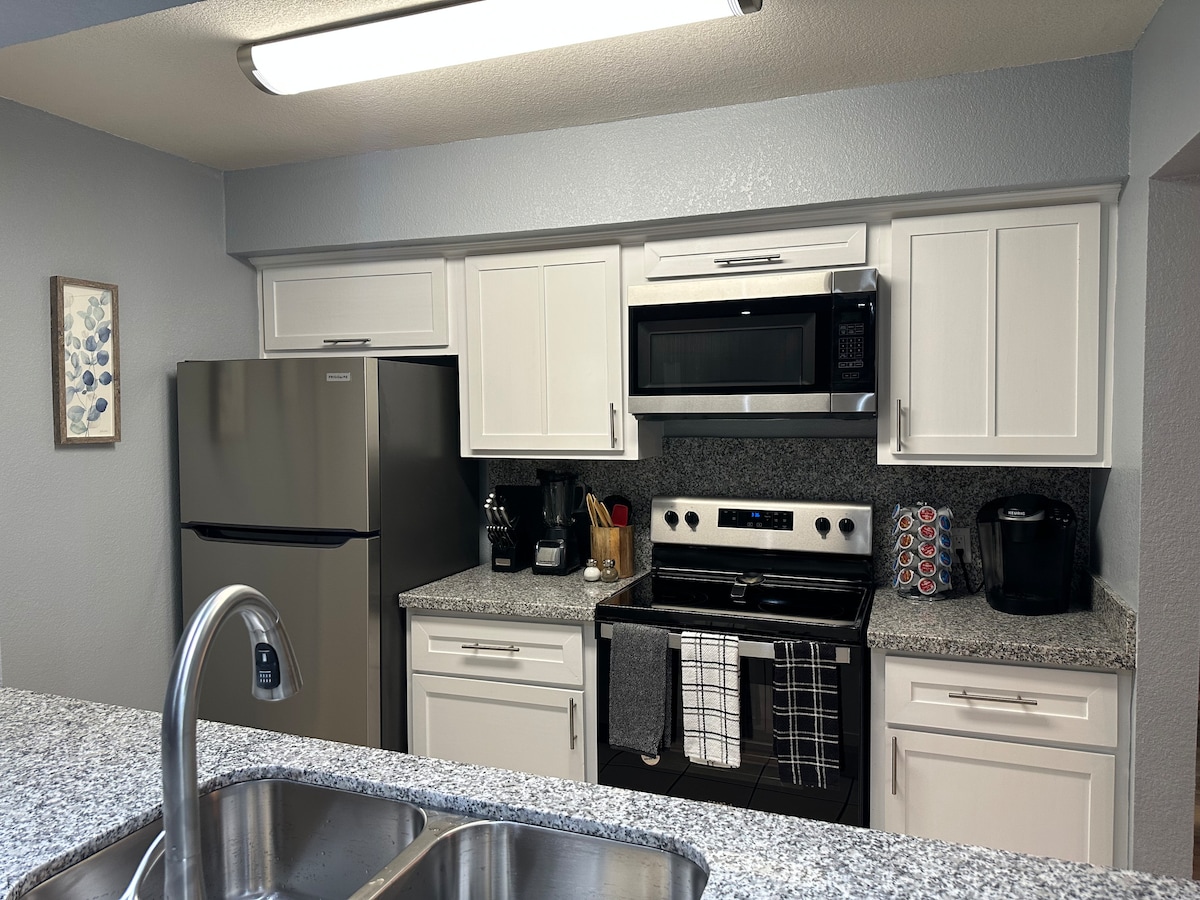 這座美麗的聯排別墅坐落在郁郁葱葱的高爾夫社區中,體驗舒適與便利。這個現代化的空間有2間臥室,有額外的睡眠選擇、2張雙人床尺寸的空氣床墊和一張沙發。享受可靠的Wi-Fi、無鑰匙入口和3臺智慧電視,可觀看Netflix、Hulu和Prime。樓上有雙人床和全尺寸床、步入式淋浴間和充足的衣櫥空間。樓下有舒適的客廳、設備齊全的廚房、1/2浴室和洗衣機/烘乾機。房客也可以使用社區泳池和健身房。