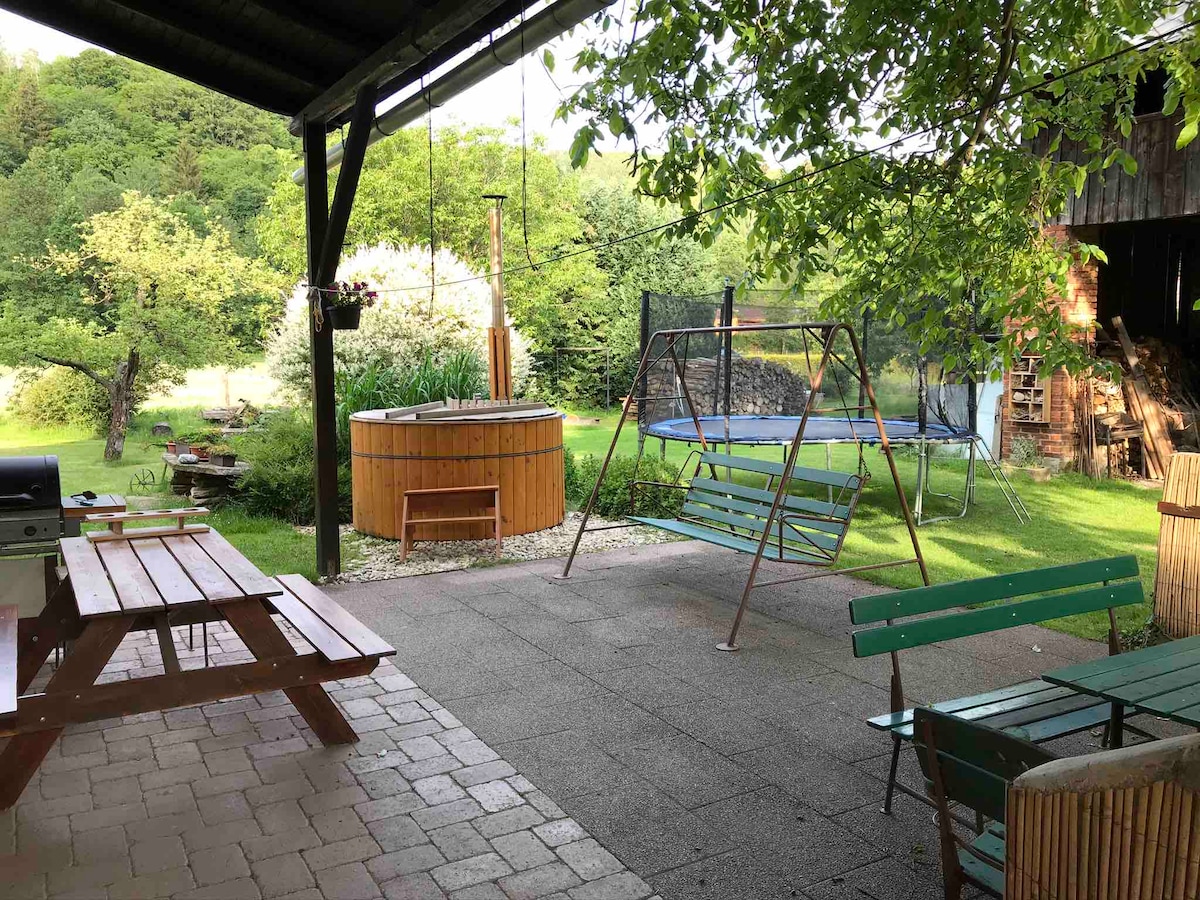 Nově zrekonstruovaná, autentická chalupa v Jeseníkách v přírodě. Ovocný sad, louky, potok a lesy. K dispozici 4 ložnice, 2 kuchyně, 1 společenská místnost a 2 koupelny. Venkovní terasy s výhledem do sadu. Welness, dětské hřiště, altán k cvičení jógy a venkovní ohniště. Fotbalové branky a pingpongový stůl pro děti. V blízkém okolí ski areály, termální lázně, cyklo trasy a nespočet horských túr. Z chalupy se můžete vydat na příjemnou nprocházku do lesní obory nebo vykoupat v nedalekém jezu.