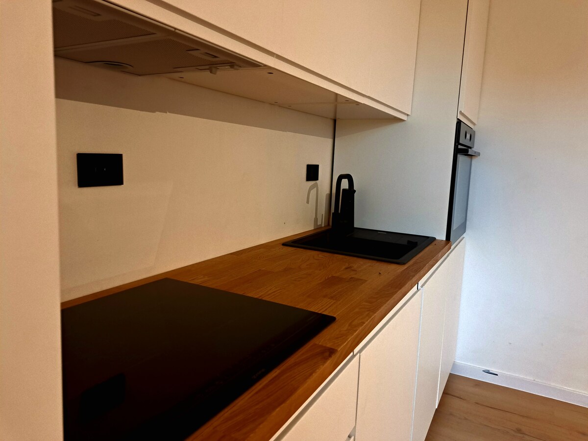 現代單間公寓位於安靜的中心區域,位於市中心,提供私密的空間。這是最近翻修的街區的一部分,有供兒童在樓梯前玩耍的空間。
