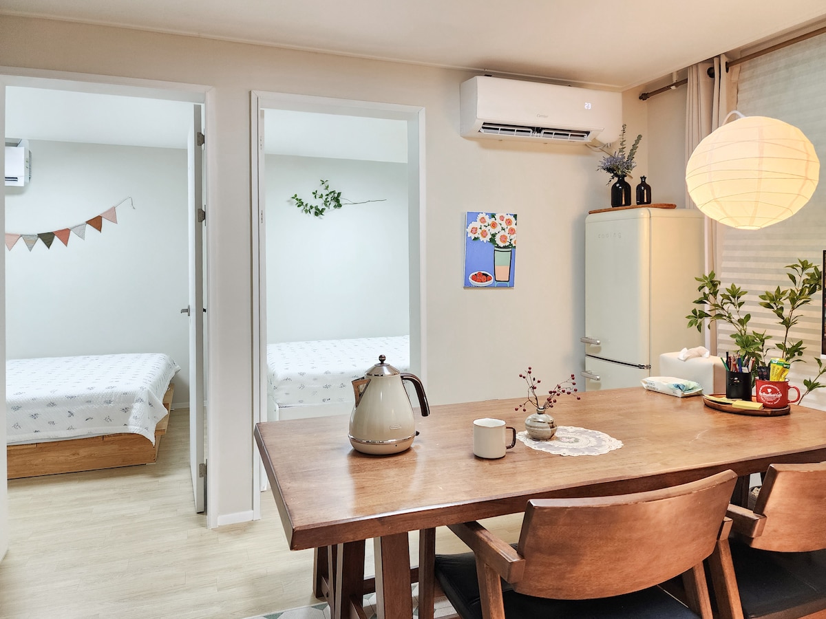 歡迎來到 Jay 's house。 從千戶站(5號線、8號線)8號出口(有電扶梯)步行2分鐘(沒有上坡)即可抵達房源(6樓,有電梯)。 您可以乘坐地鐵前往蠶室、樂天世界、樂天塔(地鐵3站)、東大門_DDP和光化門,無需轉乘。 靠近地鐵站,前往明洞、景福宮和江南都很方便。 非常適合觀看KSPO-DOME、奧林匹克大廳的表演。(地鐵3站) 這個街區安靜又乾淨,交通便利,適合觀光。 房源距離現代百貨商店、風納傳統市場、Olive Young、麵包店和咖啡店等地只有5分鐘路程,您可以在附近購物和享用美食。 房源是新建的,乾淨舒適。 最多可容納 8 人,我們追求極簡的室內裝潢,為您提供無拘無束的舒適體驗。 在家一般的空間享受家庭旅行或與朋友一起的睡衣派對。