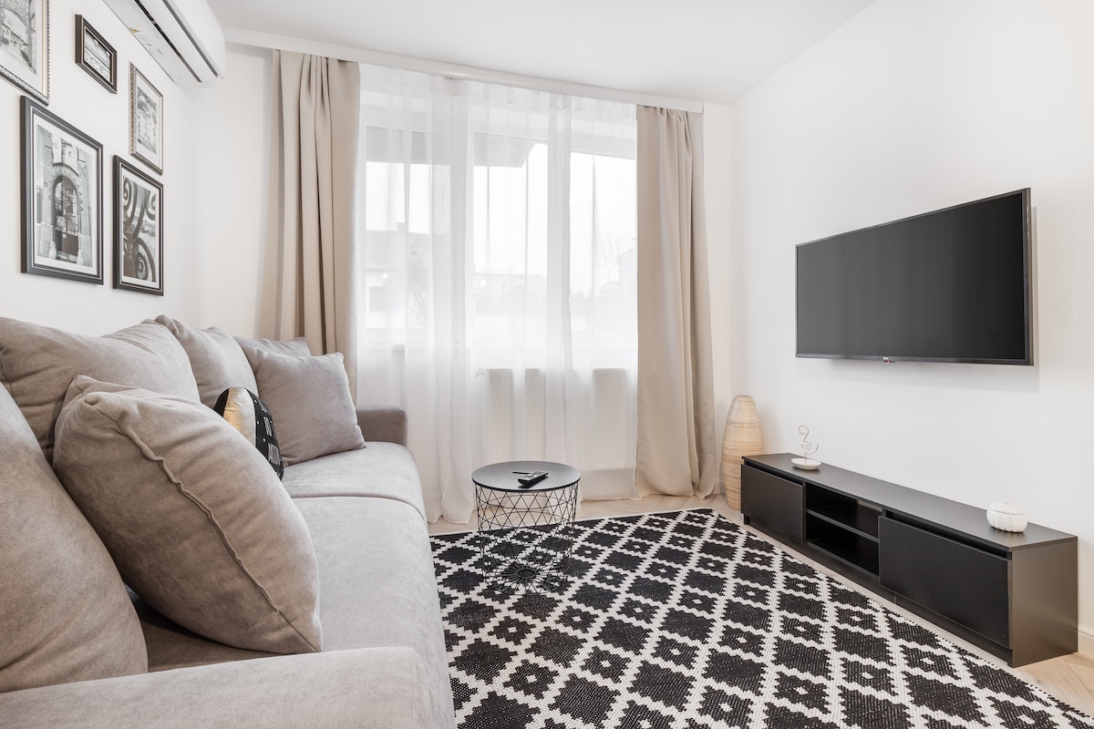 這間豪華的60平方公尺公寓位於城市的歷史區域,配有陽臺,全新且裝修精美,配有藝術新和復古風格的組合。 它位於安靜的街道上,在一個安全的街區,有免費停車位,從Vulturul Negru (黑鷹)通道步行3分鐘即可抵達步行市中心、酒吧和餐廳。 Unirii廣場-舊市中心,步行3分鐘即可抵達公寓