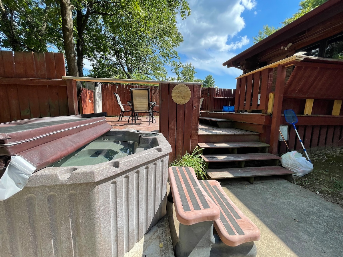 THE BEST GETAWAY HERE IN CAPE! Have a relaxing staycation here in Cape Girardeau Perfect for a QUICK GETAWAY for couples, families or friends 5 MINS to the casino, country club and downtown cape Very unique log home with a private bedroom queen size bed, pull-out queen size futon in the living room and twin size hide away SLEEPS 4. Pool table, darts, and a hot tub.There is a large deck and fire pit which has the feel of being in the woods.
